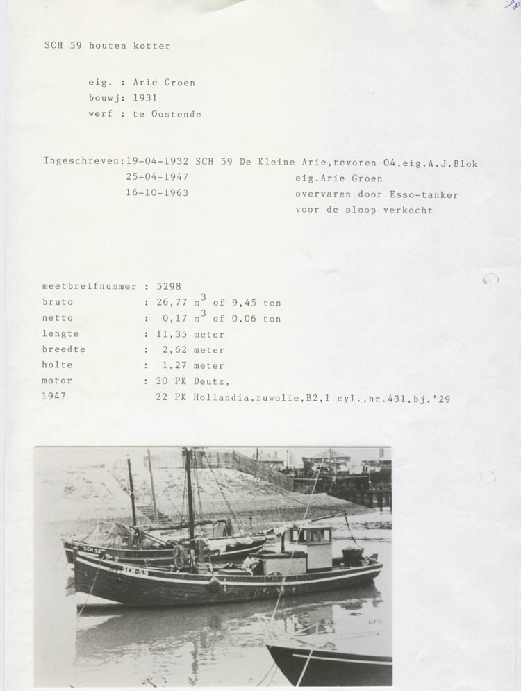 Er is er nu nog 1 zoek, namelijk de Sch 59 de Kleine Arie. Het laatste wat wij weten is, dat de Sch 59 op de nieuwe waterweg is aangevaren door een ander schip. Na de aanvaring heeft dat schip de 59 op een strandtje neer gezet. Hij is toen volgens horen en zeggen verkocht voor de sloop. Maar of dat nu werkelijk waar is geweest is een vraag teken. Dus ik ben nu op zoek naar de ware toedracht, of het verhaal van hier boven de waarheid is. Dus als iemand iets weet van wat er met de Kleine Arie is gebeurd,  nadat hij op het strandtje is geplaatst.