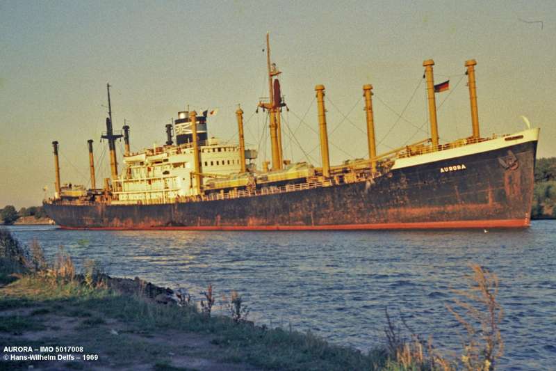AURORA General Cargo Ship – US Standard Cargo Type ship design C3-S-A5 – AURORA passing Schülp/Rendsburg/Kiel-Canal westbound | Photo: 1969 | © Hans-Wilhelm Delfs, Kiel | IMO: 5017008 | Flag: Cyprus/Famagusta | GT 8.380 | NT 4.956 | dwt 12.056 | Grain 770.600 cbft – Bale 683.040 cbft Loa 149,80 m | Lpp 142,00 m | Br 21,20 m | Draught 8,86 m | Depth 12,95 m | Yard: Sun Shipbuilding & Drydock Co., Chester/Pa./USA – Yard.No. 556 – launched 27.07.1946 – Completion 10/1946 | Engine: General Electric Co. Turb. – 8500 shp | 16,50 kn | Owner: Sg & Produce Co, Famagusta/Cyprus History: launched as GRONINGEN as one of ten vessels built (Type C3-S-A5) for Dutch owners after the war – ANDYK (1947-1969) Owner- N.V. Nederlandsche-Amerikaanse Stoomvaart Mij., Rotterdam (Holland-Amerika Lijn) – AURORA (1969-1972) – broken up Castellon 08.05.1972