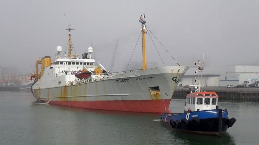 de Prins Bernard gaat er weer vandoor in een mistig schevening ,
